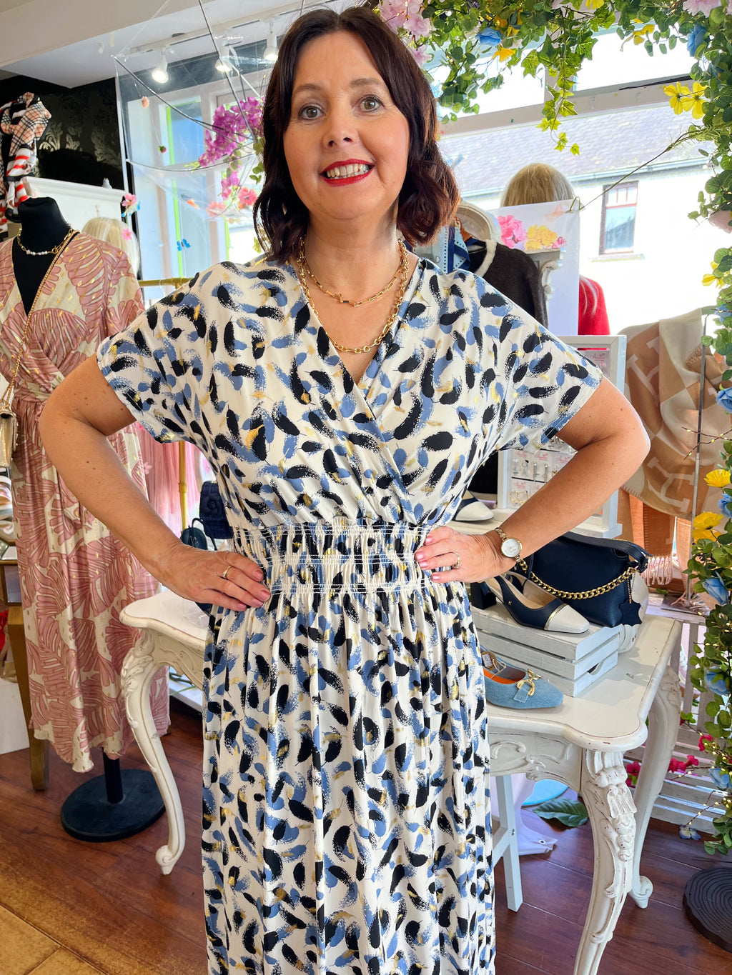 Magic Cap Sleeve Gold Leaf Maxi Dress - Cream & Blue