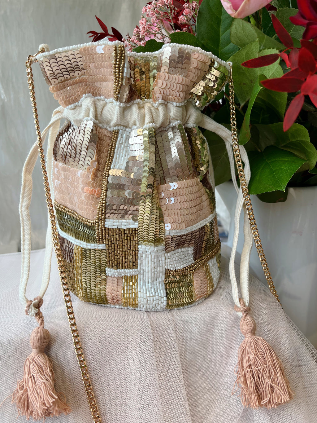 Elsie Sequin & Bead Cotton Pouch Bag - Gold, Rose & Blush