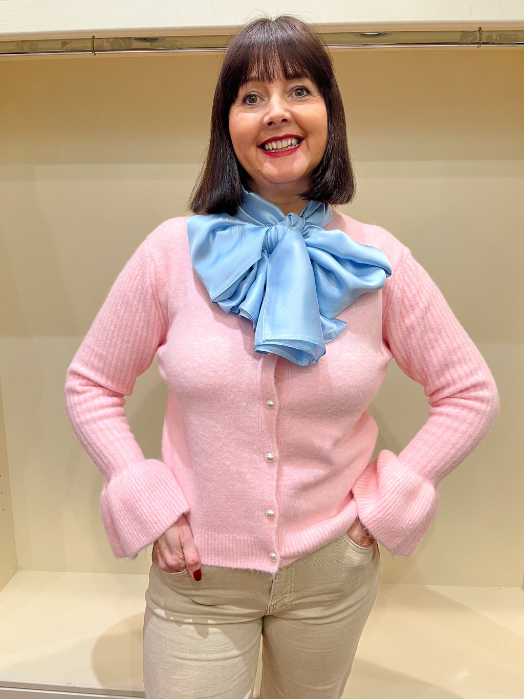 Clara Pearl Button Cardi with Bell Sleeve - Baby Pink