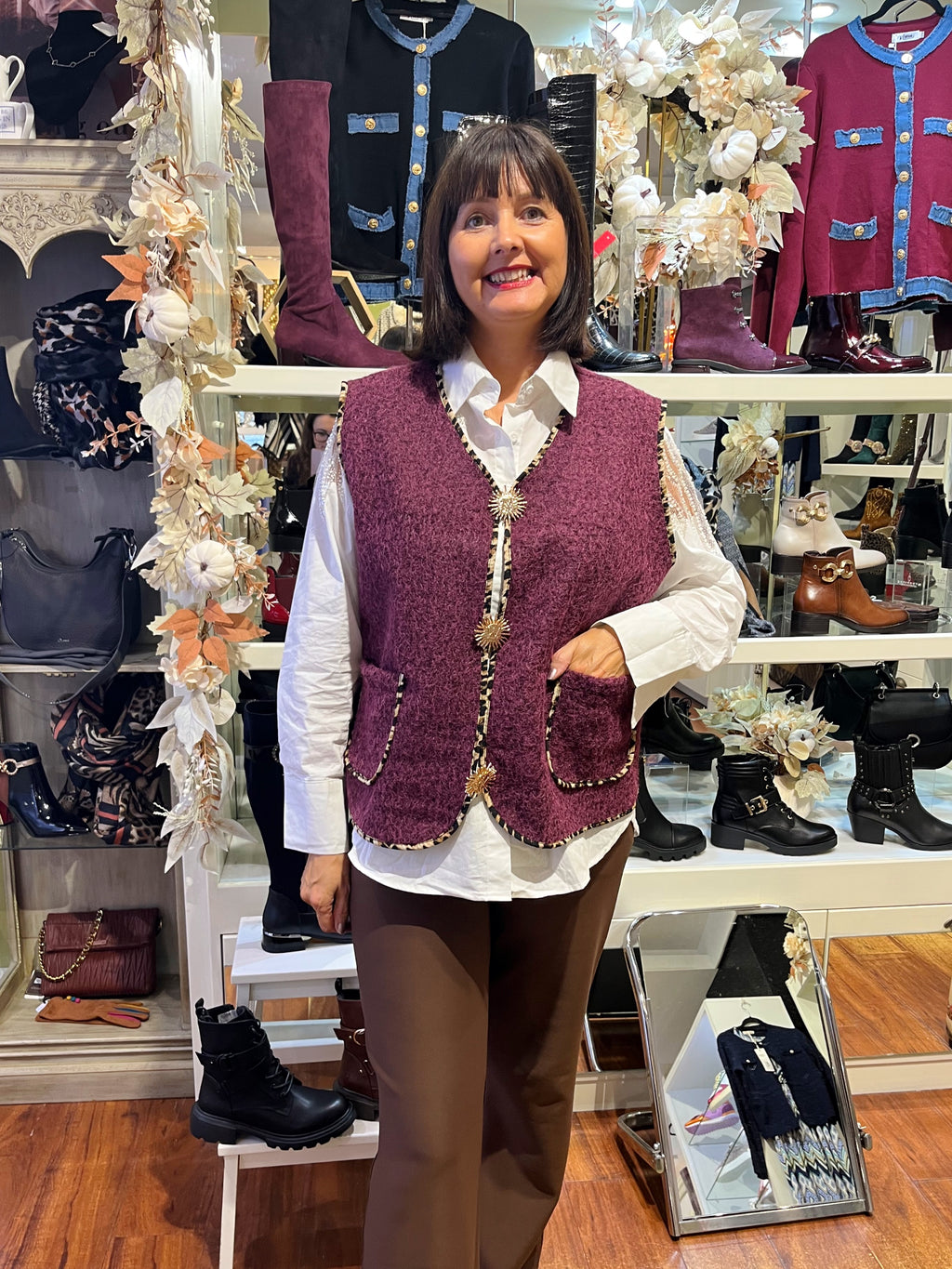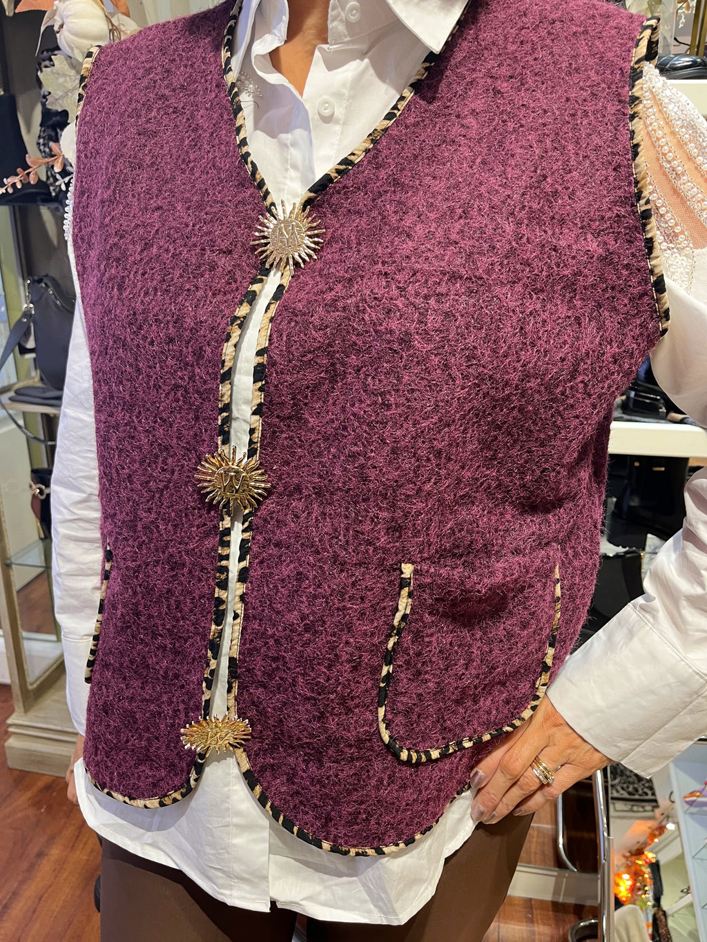 Harley Leopard Trim Gold Brooch Gilet - Burgundy