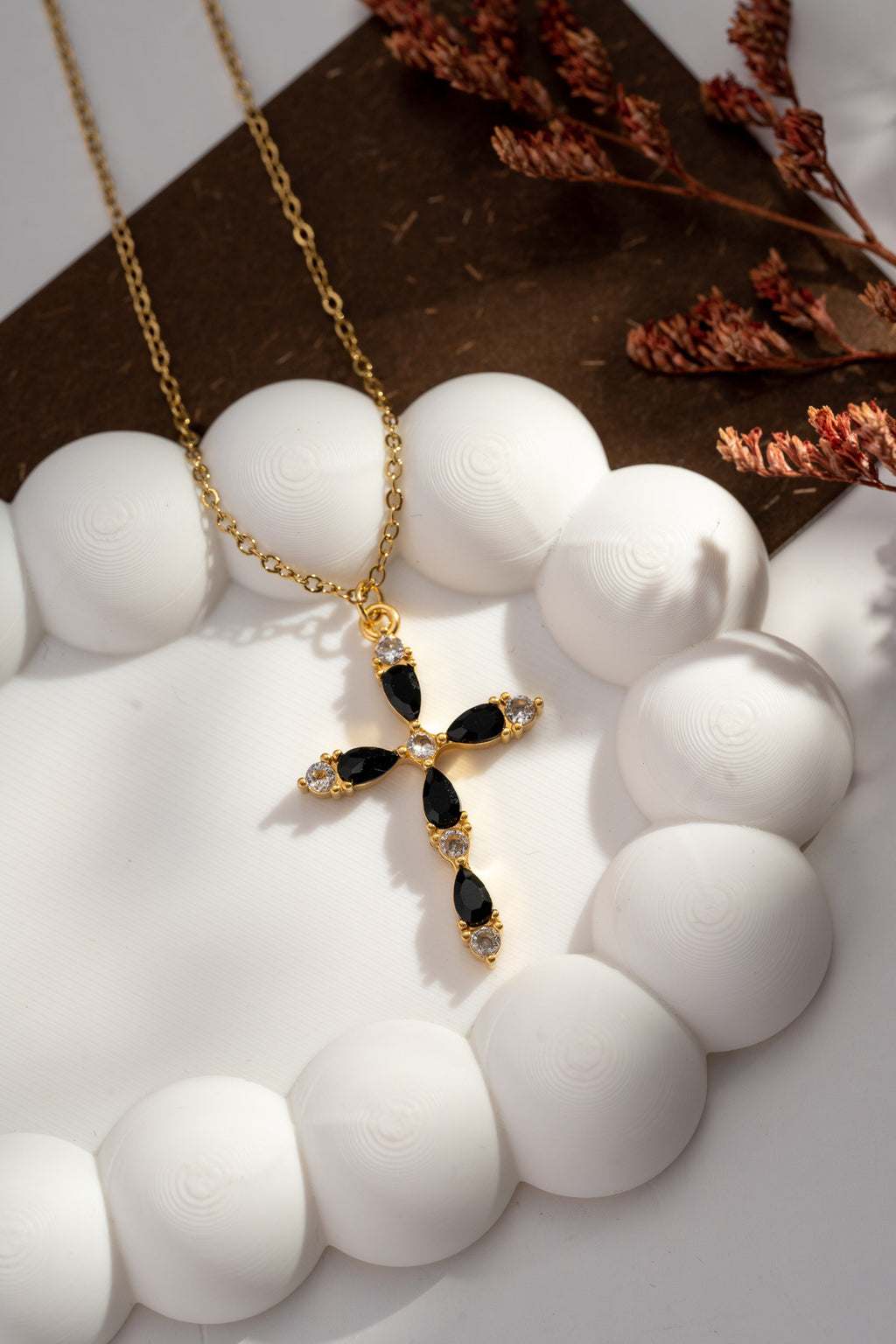 The golden cross necklace for women, adorned with sparkling crystals, embodies refinement and spirituality. A trendy and timeless piece, it lights up the neckline with brilliance. Perfect as a gift or to accessorize a chic outfit, this women's cross necklace becomes a symbol of light and style. A must-have among message-bearing women's jewelry.