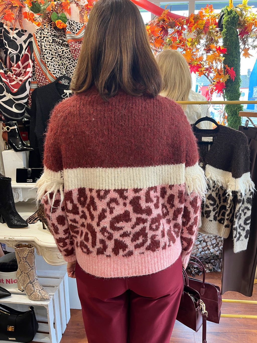 Harper Animal Print Fringe Cardi - Burgundy & Pink