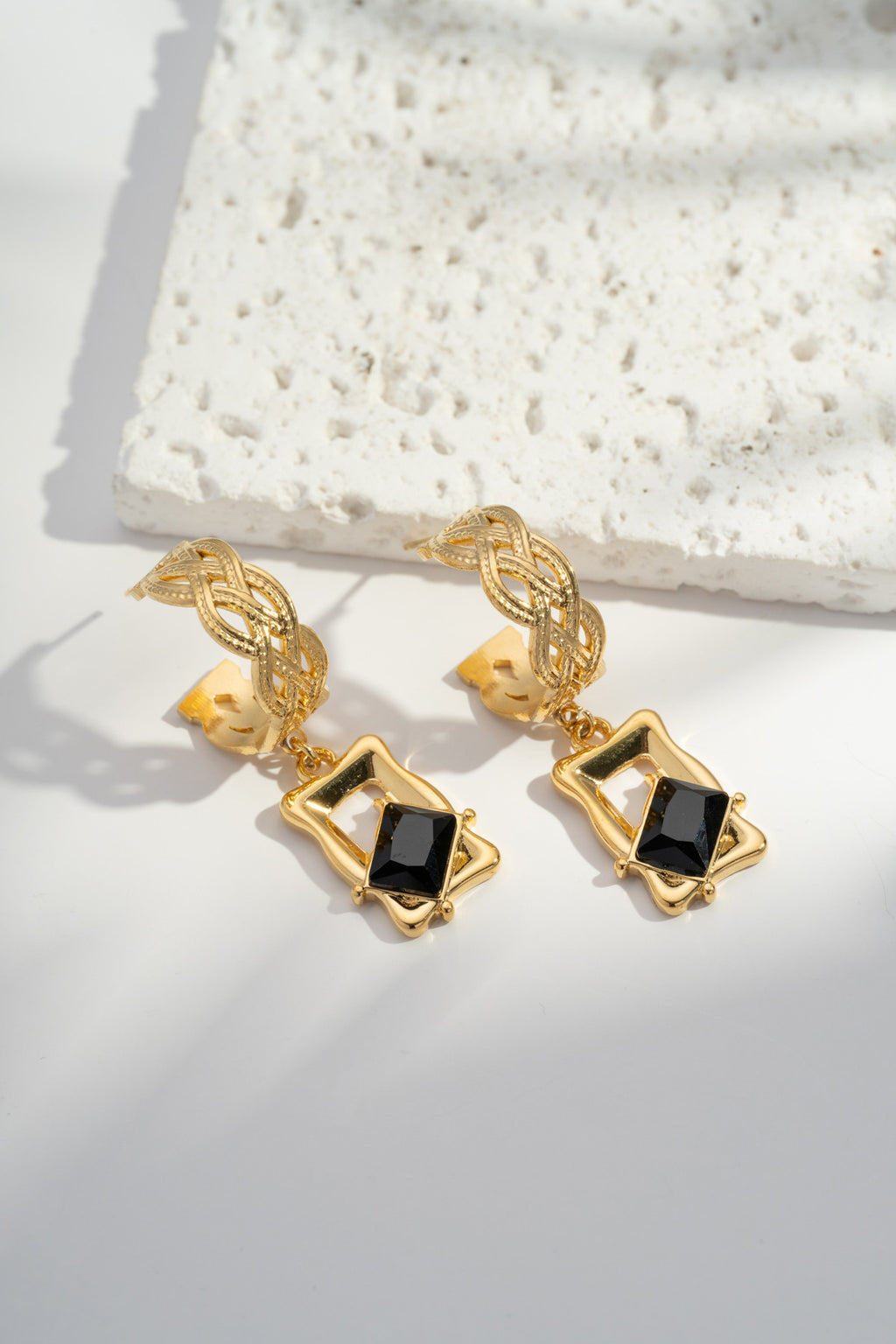 These gold stainless steel earrings feature a refined braided hoop, suspending a geometric frame set with a dazzling square stone. Available in deep black or radiant crystal, they play with contrasts and light to enhance every movement. Their structured design and subtle shine make them a piece of character, both modern and timeless. Wear them to elevate an elegant look or to enhance a minimalist style.