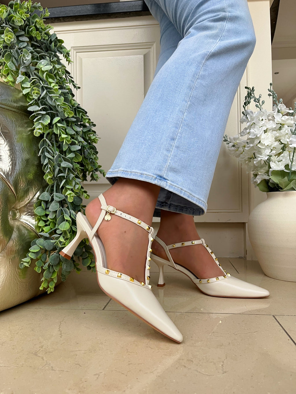 XTI Cream Studded T-Bar Stiletto 145360